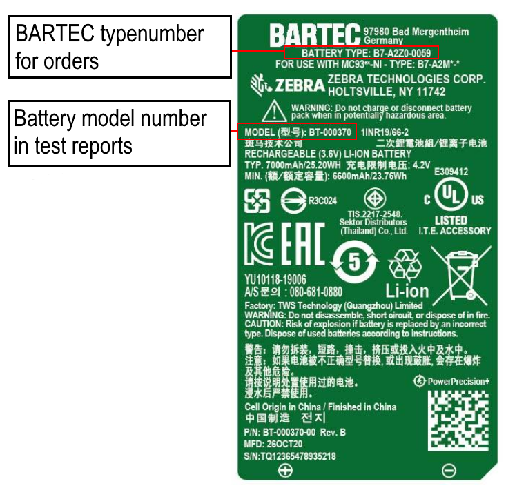 - Battery model number in test reports: BT-000370-xx