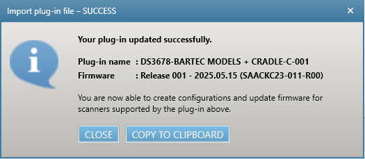 In order for the BCS3678ex to be recognized and programmed with the latest hardware version, a plugin must be installed in the Zebra 123 Scan Utility.